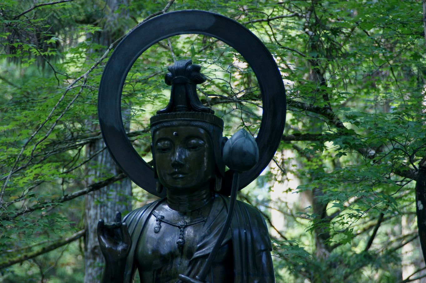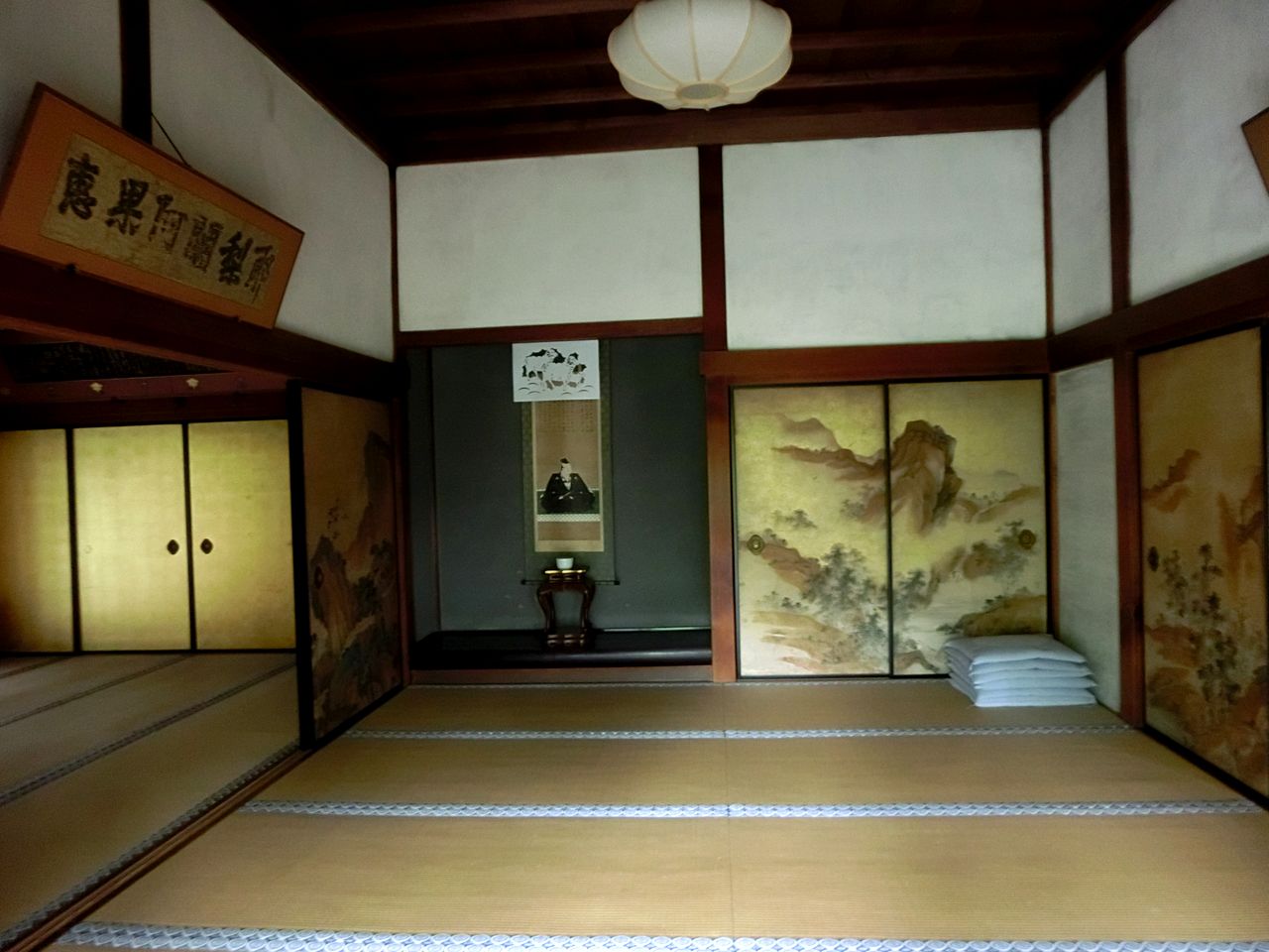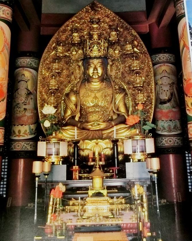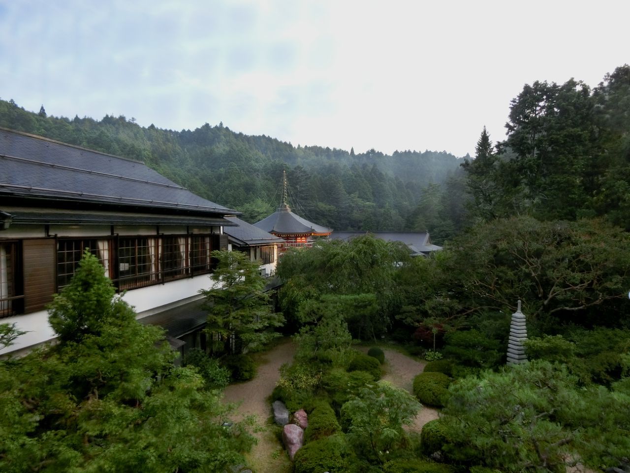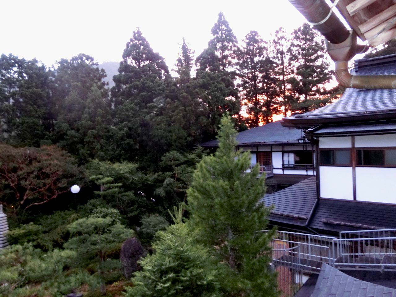 | 8月11日 翌朝5時6分、日が昇り始めています。 霧が上がりきれていません。 風情あるお庭がいくつもあります。 3つの部屋には 「お市の方」、「浅井長政」の掛け軸が飾られています。 「お市の方」の部屋 「お市の方」 「浅井長政」の部屋 「浅井長政」 奇怪な形状の「高野槇」飾り物 2階の大広間の篠原氏 高野山の屏風前の大寅の置物 6時30分からは「朝のお勤め」に参加しました。やはり多くの外国からの方々が興味有り気に参加され、御焼香にも参加されていました。お勤めは35分間、読経の始めは「般若心経」でした。その後の「お教」は判りません。 朝食は、7時15分から、もちろん、肉気はありません。 ご飯とは別に、「茶がゆ」がついていました。 8時40分、昨日行けなかった「総本山金剛峯寺」その他の伽藍へのお詣りに出かけました。岩崎氏、篠原氏 篠原氏、小生 散策ルートを地図で確認。 朝、高野山町を歩いている方々の多くは、他の観光地と同じで、外人でした。 8時47分、門の向こうに一輪のハスが見える宿坊「蓮花院(れんげいん)」に入らせてもらいました。「大賀ハス」(2000年以上前の古代ハス)で有名なところでした。 「大賀ハス」です。 「大賀ハス」のアップです。 「総本山金剛峯寺」へ 国の史跡・世界遺産。主殿等の建物は和歌山県指定有形文化財。高野山真言宗の総本山で座主の住寺。金剛峯寺は元は高野山全体の称だが、現在金剛峯寺と呼ばれるのは明治2年(1869年)に青厳寺と興山寺の2つの寺院が合併したもの。旧青厳寺(剃髪寺)は文禄2年((1593年)、豊臣秀吉の建立、文久3年(1863年)、再建。歴史天皇の位牌や高野山真言宗管長の位牌をまつっている。・・・(ウィキペィアより) 8時52分、金剛峯寺の手前まできました。 「総本山 金剛峰寺」の紹介版です。 8時53分金剛峯寺。篠原氏、岩崎氏 金剛峯寺門に入ります。 門から金剛峯寺大主殿を撮ります。 本尊と結んでいる綱を持つ岩崎氏 篠原氏 大主殿の本玄関 大主殿内の廊下 廊下から一部室内が 小さいけれど風雅のある「枯山水石庭」 石庭とは違った木々が特色のお庭 「蟠龍庭(ばんりゅうてい)」 順路に従って辿っていくと、ご接待のお茶を頂くことになりました。赤い絨毯の敷かれた新別殿大広間で頂戴します。弘法大師、曼荼羅、般若心経が置かれた正面 彫り物の般若心経 大広間の後方 「真然大徳廟」の案内 「真然大徳廟」 巨大なお釜、なべ、おくどさんが並ぶ台所 金堂前の空間に不思議なものが立っていました。 「森林のいのちの塔」の説明 9時34分、「金剛峯寺」のお詣りを終え、多数の建物が待つ「壇上伽藍」へ向かいます。 「壇上伽藍」へは500mです。 「高野山の草創」についての案内、この地は海抜820m、弘法大師がこの地に堂塔を創りはじめたのが、弘仁7年(816年)で、開創1200年紀ということでしょう。 「壇上伽藍」へ (壇上伽藍の建物配置図) 9時38分、「壇上伽藍」に登りました。 手前から「東塔」、「大会堂」、「根本中堂」A。 B 岩崎氏 C 篠原氏 「東塔」 「三昧堂」 「大会堂」 「愛染堂」 「不動堂」 「不動明王坐像」(平安時代 重文 「古寺をめぐる」から) 「根本大塔」 大塔の内部は立体曼荼羅を出現させています。写真の中心は「大日如来坐像」 主に輝く、華麗な大塔の内陣には、本尊の胎蔵界大日如来坐像を中心に、阿シュク・宝生・阿弥陀・釈迦の金剛界4仏が祀られている。16本の柱には堂本印象(どうもといんしょう)の筆のよる十六大菩薩像が描かれ、曼荼羅世界をあらわす。本尊の胎蔵界大日如来像は江戸時代の作という。(以上 古寺を巡る9 高野山から)(堂本印象の筆と思われる襖絵1 2 金堂回廊から撮影できたもの) 「根本大塔」をバックに篠原氏、岩崎氏 木の向こうは「孔雀堂」、「准胝堂」 壇上伽藍の中心である「金堂」 「三鈷の松」の後ろは御影堂 「御影堂」 「准胝堂」 「孔雀堂」 「孔雀明王像」快慶作 重文 (写真は「古寺を巡る」からです。) 「西塔」 「西塔」の説明板 大杉をパックにする篠原氏。岩崎氏 「六角経堂」 壇上伽藍には高野山の地主神(丹生都比売神社と高野明神社)をお祀りしています。 「『不断経』読経中の金堂」 「不断経」を聴きながら周囲を動画で 「金堂」回廊から「三鈷の松」、「御影堂」、「准胝堂」、「孔雀堂」 「金堂」前の篠原氏 「中門」の金剛力士には正面の阿吽像とは別に裏側に特異な金剛力士が治められています。 阿像A 阿像B 吽像A 吽像B 仏師松本明慶氏(「増長天が槍を持っているのは、邪悪なものから守るため」。その象徴として、胸の甲冑にトンボをあしらった。「トンボは前にしか飛ばない。決して退却しないぞ、という強い意志を示したかったんです」 広目天像の胸には、セミをとまらせた。広目天は、広く見渡すのが役目だ。どこまでも声が届くセミによって存在感を示し、「すべてを見ている」ことを表現した。いずれも、伝統的な四天王像にはなかった。) 「大門」 高野山全体の総門。1705年再建。国の重要文化財・世界遺産。(ウィキペィアよ