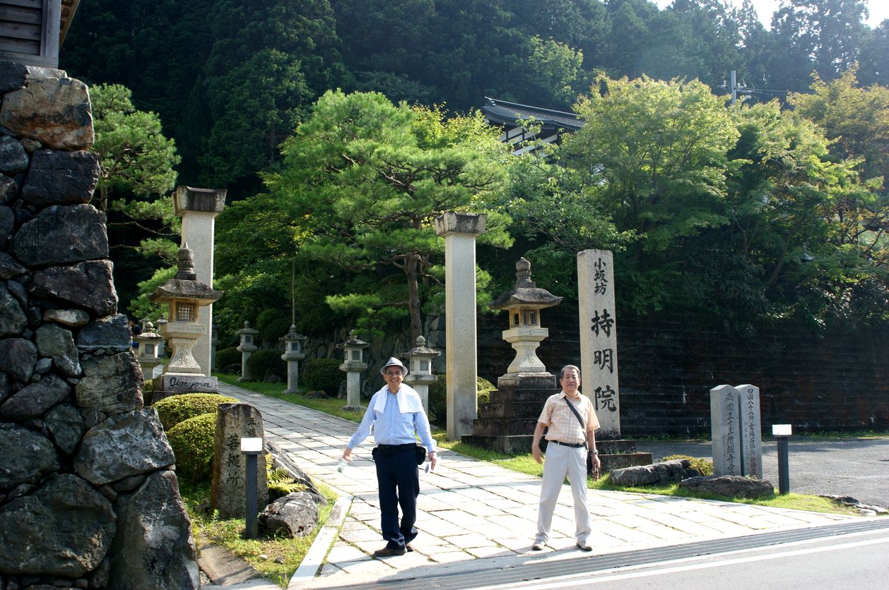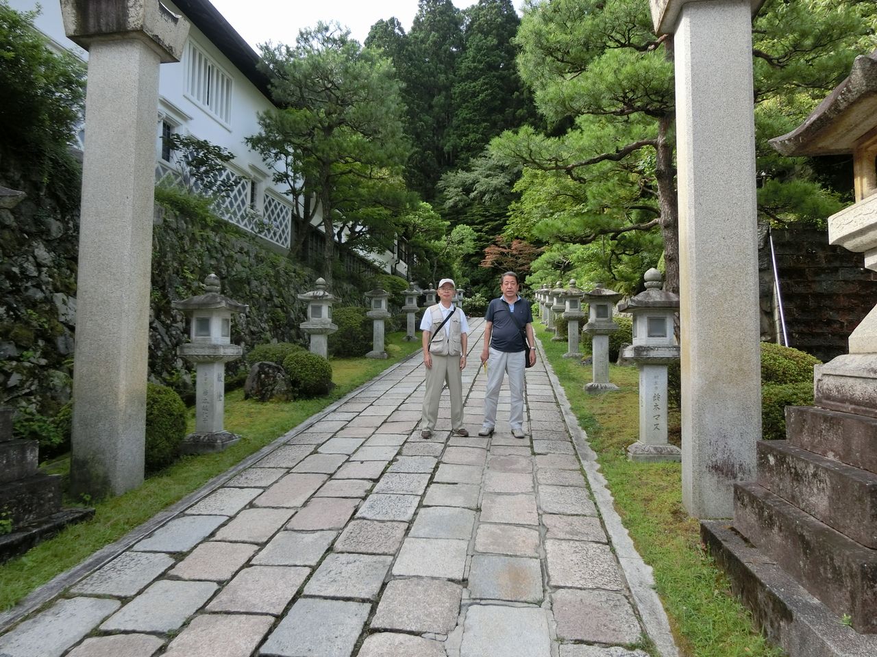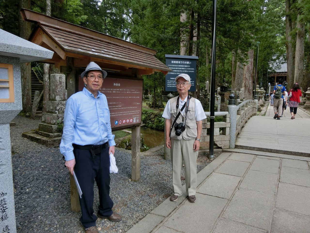 | 2015年8月10日 今年のお盆を控え、7日は西国33ヵ所観音霊場32番観音正寺、33番谷汲山華厳寺をお詣りし、西国観音霊場の満願を果たし、10日、11日は高野山金剛峯寺をお詣りし、ご先祖を偲ぶとともに、京都に住む我が一家眷属の健康を祈願することが出来ました。 開創1200年紀にあたる今年、「高野山へお詣りに」とのジジ連幹事の篠原氏の提案にもちろん大賛成、このお山に自家のお墓を持つ岩崎氏は「丁度盆前の墓掃除が出来る」と大賛成ということで、10日、11日の高野山への旅が決まりました。ジジ連メンバーのあと二人はお盆の予定があるとのことで、残念ながら不参加でした。 宿坊「持明院」への予約など、全て篠原氏が手配してくれ、さらに、車での往復も篠原氏が受け持ってくれました。ホント有難いことです。 7時15分、篠原氏が家の前まで来てくれました。約束の7時には道路の渋滞のためチョット遅れたのですが、この道路の渋滞は枚方を抜けるまで続いていました。 9時28分、PLの塔の横を抜けます。 10時丁度、橋本市へのトンネルに入ります。 10時30分、371号線を橋本市市街へ走ります。 10時39分、紀ノ川を渡り、高野山へは27キロ地点を抜けます。 11時13分、高野山までは7.5キロ地点です。 11時21分、海抜が600mあたりにまで登ってきました。(ちなみに、高野山は海抜800m以上です) 11時31分、高野山金剛峯寺前に着きました。 この後、車ではイチニ分の持明院を目指しましたが、カーナビに騙され、お墓の掃除後、持明院の道路に面した駐車場前で待っていてくれたI氏にたどりついてのはナント12時を過ぎた時間となっていました。なんと、30分近くウロウロしていたことになります。 宿坊「持明院」へのアプローチ、持明院と彫られた立派な石柱が迎えてくれました。 チェックイン時間は15時とされていましたが、部屋は整理できているということで、部屋に入り、一休みすることができました。 庭の緑が長時間の乗車を癒してくれます。 池には鯉の姿も見えています。 「高野山町全体図」 「奥之院詳細図」 12時23分、奥之院への出発です。岩崎氏、篠原氏 篠原氏、小生 岩崎氏の勧めで、胡麻豆腐の濱田屋さんに寄ります。 1つ300円の山葵胡麻豆腐を2つ頼みます。 岩崎氏 篠原氏 翌日の為にお土産の予約をする岩崎氏 一口でいえば、美味、「濃い味」は間違いありません。 満足げに暖簾を分ける篠原氏。 結局、嫁さんへのお土産にしました。 「奥之院」へ 国の史跡・世界遺産。空海の御廟と灯籠堂がある。参道には、皇室、公家、大名などの墓が多数並び、その総数は正確には把握できないものの、20万基以上はあると言われている。戦国大名の6割以上の墓所がある。奥之院の入り口は一の橋と中の橋の二か所あるが、正式には一の橋から参拝する。一の橋から御廟までは約2kmの道のりとなっている。(以上 ウィキペィアから) 奥之院への道、宿坊「遍照光院」 13時1分、「刈萱堂」篠原氏、岩崎氏 岩崎氏、篠原氏 篠原氏、小生 宿坊「地蔵院」 宿坊準別格本山「恵光院」 それぞれ由緒のある宿坊です。ちなみに高野山には51の宿坊があるようで、我々が訪れた「小坂坊 持明院」もその一つです。 13時10分、奥之院近くに来ました。 一輪の蓮花が迎えてくれます。 13時12分、奥之院入り口、「一ノ橋」へ。 岩崎氏、篠原氏 篠原氏、小生 「一ノ橋」を渡り、奥之院墓所に入ります。 「奥州仙台伊達家墓所」 「司馬遼太郎文学碑」 「司馬遼太郎文学碑」前の我々3ジジ 今回、重い三脚を持参しました。 「薩摩島津家墓所」 「山口毛利家墓所」 「森中将忠政墓所」(戦国武将、信濃国川中島藩主、後美作国津山藩初代藩主、父は信長の家臣、森可成の6男、森蘭丸の弟ということになる) 「岡山津山森家墓所」 「竹田信玄勝頼墓所の解説板」 「竹田信玄勝頼墓所」 篠原氏、岩崎氏 ジジ連の3人 薩摩島津家初代家久2代光久、綱久墓所」 「石田三成墓所」 「信州高遠内藤家墓所」 「伊勢桑名城主本田忠勝墓所」 「棺掛桜」 (棺掛桜の由緒は?不思議な話ではあります) 「安芸浅野家墓所」 「芭蕉句碑」 「伊予松山松平(久松)家墓所」 「加賀前田家二代利長墓所」 「法然上人圓光大師墓所」 「結城秀康(家康次男)石廊」 「豊臣家墓所の案内」 「豊臣家墓所」1 「豊臣家墓所」2(中心は秀吉の石塔) 「織田信長墓所」 「信長墓所」の3ジジ 14時4分、「御廟橋」に着きました。岩崎氏、篠原氏 岩崎氏、小生 御廟橋の解説です。 ここからは本当の奥之院、弘法大師空海御廟の霊域に入ります。もちろん写真撮影は禁止、話す言葉も注意が必要です。 石段を登り、「灯籠堂」(高野山第二世真然大徳(しんぜんだいとく)によって建立され、治安3年(1023年)に藤原道長によって、ほぼ現在に近い大きさになったと伝えられています。堂内には消えずの火として祈親(きしん)上人が献じた祈親燈(きしんとう)、白河上皇が献じた白河燈、祈親上人のすすめで貧しいお照が大切な黒髪を切って献じた貧女の一燈(いっとう)、昭和の時代にある宮