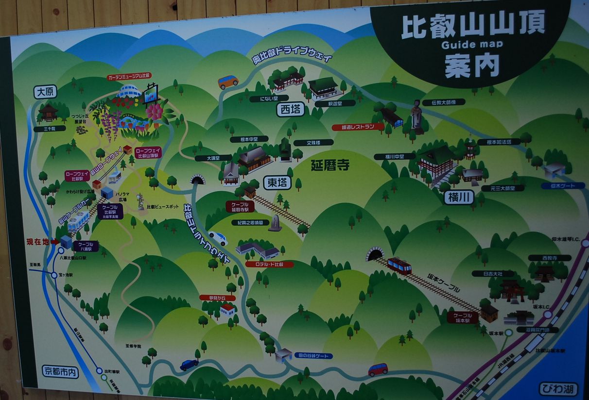 | 前回は、2008年10月11日、「休暇村近江八幡」への”ジジ蓮の旅”を利用しての、比叡山延暦寺参詣でした。この折は車での登山でしたが、今回は、「エクシブ京都八瀬離宮」からの出発となるため、ケーブルでの登山、参詣となります。 八瀬ケーブルの始発、9時に間に合わせるため、7時前に家を出発します。バスで新田辺へ、近鉄で丹波橋へ、京阪で出町柳へ、京福電鉄で八瀬比叡山口駅へ。連絡が極めてよく、8時過ぎには比叡山口駅へ到着してしまいました。今年一番の寒さは、この地では特に厳しく感じます。折角ですので、高野川沿いの散策をします。「京都の寺社505を歩く」の八瀬の地についての記述です。「八瀬の地は、壬申の乱(672年)のさい、この地で大海人皇子(天武天皇)が敵方の流れ矢背中に傷をおったことから、矢背とよばれるようになったというが、もちろん伝説の域をでない。ただ『都名所図会』などには、『矢背の里』とあって、小さく八瀬とも書くと注記される。矢が背というよりも、このあたりで高野川の流れが速くなり、多くの瀬を形成していたための地名由来と考えるべきであろう。また、八瀬は行幸(ぎょうこう)や還幸(かんこう)の際や大葬のときに天皇の輿(こし)をかついだ八瀬童子と、かま風呂で知られ、近年には八瀬遊園で賑わったが廃園となり、跡地にリゾートホテルが建つ。・・・・ ケーブル、ロープウェーを乗り継いで山頂へ。 駅を出ると、木の橋が架かっています。霜なのでしょうか?滑りそうな板を踏みしめながら渡ります。風情のあるお茶屋さんがあり、「瑠璃光院」の案内板が立っています。川沿いの道を歩き、「瑠璃光院」山門まで行って見ました。開門が10時からとの案内を見て引き返すことになりました。秋の特別拝観中であるだけに、チョット残念ではありました。「八瀬離宮」のケーブル駅口の確認をし、「さば街道」沿いを少しだけ歩き、今度は石橋を渡り、ケーブル駅へ。 今日の行程を駅にある比叡山概略図で確認します。 始発9時のケーブルには、10人ほどの登山姿の一団を含め、20人ほどのお仲間です。ケーブルカーは10分の乗車で、登山姿の一団を除き、12分発のロープウェーへ乗車します。標高差約500メートルを数分で登ります。山頂駅から数分歩くと山頂バス停に。その広い広場からの景観は見事なものです。朝靄が消える前、そして、朝日に反射して輝いている琵琶湖湖面は幻想的です。写真になるとその雰囲気は伝えられません。京都市街地、東山方面。 そして、平安神宮の赤の鳥居を望遠レンズで捉えてみます。10時発のシャットルバスを見送り、少し山頂駅方向に戻り、道案内に従って、延暦寺東塔方面に向かいます。数分歩くと、小さな仏様が並ぶ、展望台に着きました。ここから見下ろせるのは八瀬の村落と思われます。 |