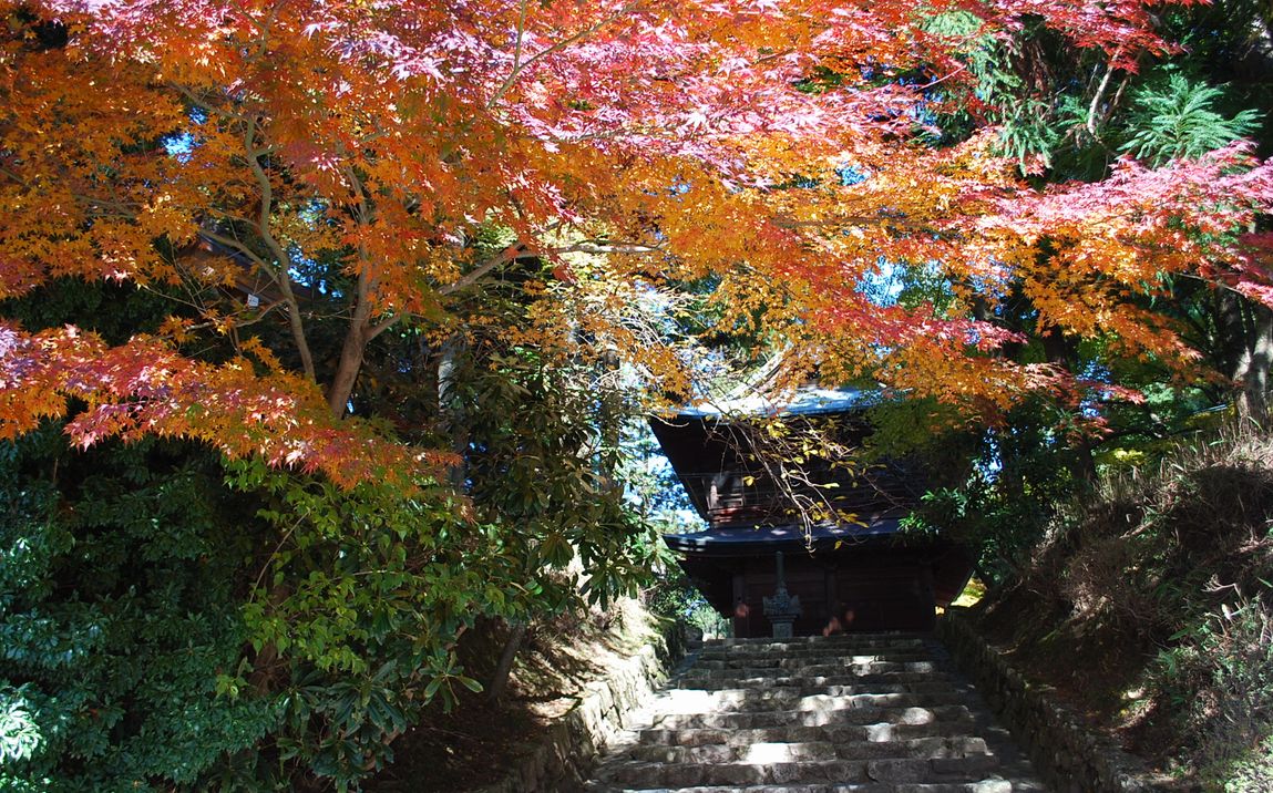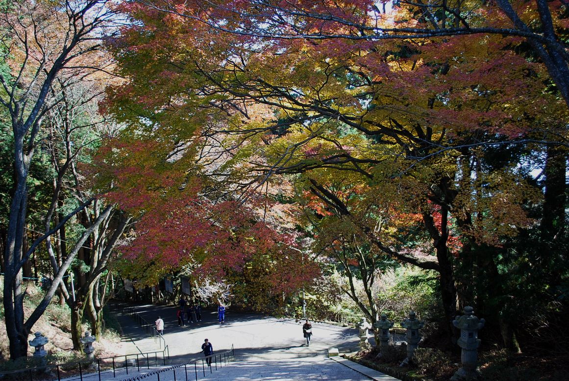 | 背景は「文殊楼」前の階段状からのもみじの「根本中堂」です。 |