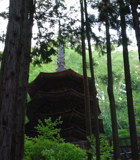 | 「見返りの塔」国宝大法寺三重塔 15分ほどで、大法寺へ。沢山の五百羅漢が出迎えてくれています。その表情を楽しみながら参道を登ると、観音堂へ着きます。観音堂の左手を見上げると、丸く選定された”さつき”、既に花が茂っている”つつじ”の向こうに優美な三重塔が出現します。 国宝大法寺三重塔は頂戴したパンフレットの伊藤延男氏によると 「大法寺三重塔は、『見返りの塔』という名で親しまれている。その名は、塔の姿があまりにも美しいので、思わず振りかえるほどであるという意から、つけられたのであろう。・・・なお、この塔の美しさを論ずるには、周囲の光風との調和を見落とすことも出来まい。塩田平を見おろすことにできる丘の中腹に立っているこの塔は、その周囲をゆっくり歩くにつれて、さまざまな角度からながめられる。・・・私見では女人高野といわれている「室生寺の五重塔」と雰囲気が似ていると思われます。大変に優美で、鄙には稀と言っても良い(塩田の方々には大変失礼で、申し訳ありませんが。)大変に美しい三重塔です。帰り道にも、五百羅漢がお見送りをしてくれています。 |