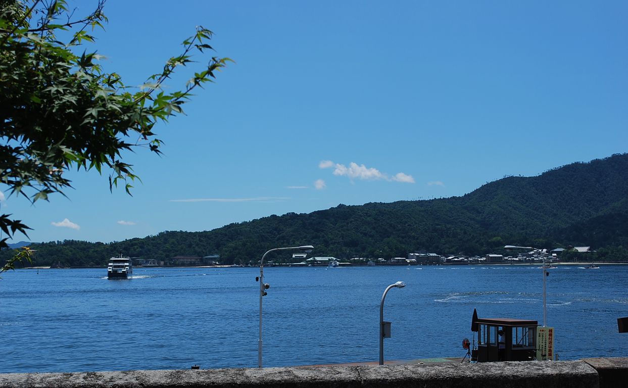 | 安芸宮島・厳島神社へ この旅では、新幹線を福山駅で降り、バスに乗り換えます。このまま広島駅まで直接行けば私達にとっては良いと思うのですが、その辺は、阪急さんの都合があるのでしょう。時間調整も考えられます。 10:45 車窓から、宮島が見えてきます。 11:05発のフェリーまでの時間、カメラのシャッターを押します。 多くのフェリーが海峡を行き交っています。 乗船時間はわずかで、宮島に到着します。 宮島は通称で、正しくは「厳島」(いつくしま)というようですが、言わずと知れた日本三景のひとつ、世界文化遺産のひとつです。帰りのバスの中で「この島は意外に大きいのではないか?」と感じられたように面積は約30平方キロ、周囲は約30キロ、標高は535M、最高峰は弥山、安芸灘にあります。 お目当ては、「海に浮かぶ厳島神社の赤い大鳥居と優美な朱塗りの社殿」ですが、今回は引き潮のために社殿ばかりでなく、大鳥居まで歩いてゆける有様で、せっかくですから、もちろん大鳥居の下まで行ってきました。海の青、島の木々の緑、神社、鳥居の朱の景観はやはり日本三景のひとつとの感慨をつよくしました。以下、写真での紹介とします。 1) 廻廊に足を踏み入れます。ここからの景観ですが、海水がありません。 2) 客(まろうど)社祓殿を本殿横から。五重塔が背景に。 3) 本殿。(国宝) 4) 本殿の祭神は「宗像三女神」の「市杵島姫(いちきしまひめ)」・「湍津姫(たぎつひめ)」・「田心姫(たごりひめ)」です。 5) 反橋(そりばし)。(かっては勅使橋ともよばれていたとのことです。重文) 6) 清盛神社方面から大鳥居を望みます。 7) 神社裏手、陸地部分からの眺め。海水の満ちていない様は物足りません。 8)五重塔 9) 大鳥居全貌 10) 大鳥居をしたから見上げます。 11) 巨大な「伊都伎島神社」の額。 12) 大杓子(おおしゃもじ) と 解説文 です。 (参考写真として、宮島のホームページから、海水がある時の、風景を T社殿 U大鳥居 ) 12:50 フェリーで宮島を後に、宮島口に戻ります。フェリー乗り場横のレストランで昼食。嫁さんはうなぎ、あなごなどが苦手な為、ピリ辛の広島風冷麺を生ビールと共に食します。結構美味かった。14時、「錦帯橋」を目指して出発します。 |