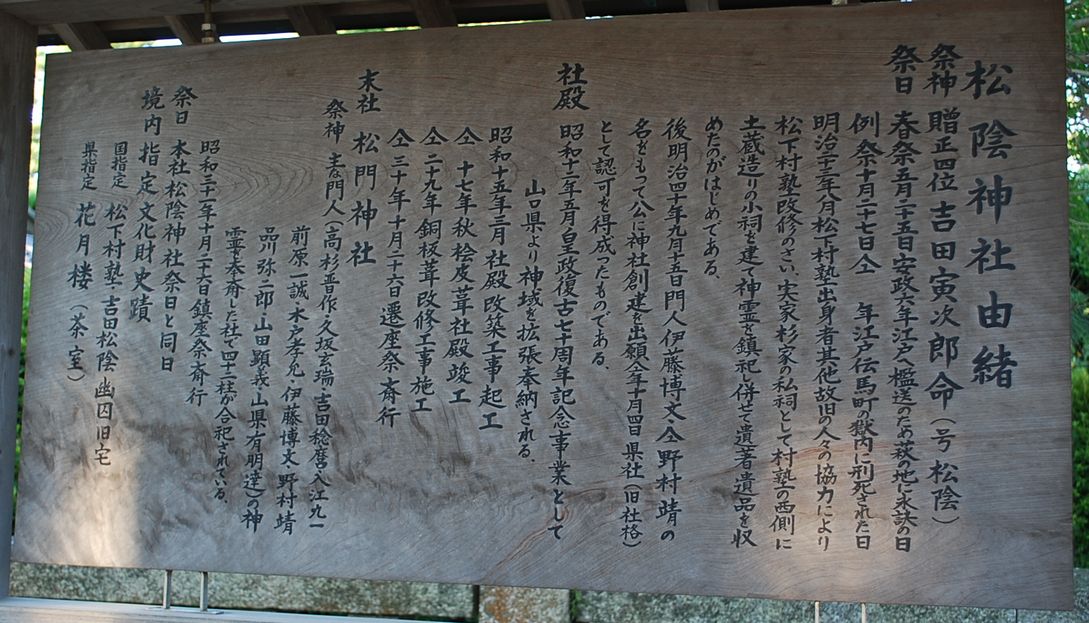 | 萩へ 萩市観光ポータルサイトによる萩市のあらましは以下のようです。 萩は萩城跡や武家屋敷、町家などの江戸時代のまちなみ、歴史的景観を数多く残しています。そして、吉田松陰をはじめとした近代日本の夜明けを告げた人々が育ち、日本を動かした人々の出身地としても知られているところです。また、北長門海岸国定公園などの豊かな自然、400年の歴史をもつ萩焼などたくさんの「おたから」があります。 萩の市街地は、阿武川の支流である松本川と橋本川に囲まれた三角州を中心につくられています。三角州の北側には日本海がひろがります。その沖には、羽島・大島・櫃島・肥島・尾島・相島の6つの平らな島々がうかんでいます。また、萩沖から45キロメートル先にある見島は手つかずの自然が残り、見島牛をはじめとした天然記念物も生息しています。 萩のまちでは、江戸時代の城下町絵図を、現在でもそのまま地図としてもちいることができます。それは、江戸時代に築かれた城下町の道や屋敷地が、ほとんど変わることなく受け継がれているということです。天災や戦災を免れたため現在もなお萩城跡や武家屋敷、町家、古刹等の江戸時代のまちなみ、歴史的景観を数多く残しています。 関ヶ原の戦いに敗れた毛利輝元が、慶長9年(1604)に萩の地に築城・開府し、文久3年(1863)に藩府が山口に移るまでの約260年間、毛利氏36万石の城下町として栄えました。また、萩市には近代日本の夜明けを告げた人々が育ち、明治維新胎動の地として、吉田松陰をはじめ木戸孝允、高杉晋作、伊藤博文など多くの逸材を輩出し、近年まで4人の総理大臣をはじめ著名な政治家が生まれ、日本を動かした人々の出身地としても知られているところです。 萩で訪れてみたい場所として、「松下村塾」と「萩城址」をネットでチェックしていました。 17:40 にはホテル(萩グランドホテル天空)に到着。 19時の夕食時間までの間に、「松下村塾」のある「松蔭神社」へ向かいます。 夕景が見事な「松本川」を渡ります。 「松蔭神社」までは約30分の距離でした。途中には、そお!!ここは萩焼の里です。 松蔭神社にお参りし、 「松下村塾」を見学。当時のつつましい佇まいを実感します。 1) 松蔭神社です。 2) その説明板です。 3) 松下村塾です。 4) その説明板です。 5) 吉田松陰幽囚の旧宅です。 6) その説明版です。 ホテルへの帰着は、夕食開始時間ぎりぎりとなったので、温泉は食後ということにして、シャワーを浴びて、夕食会場へ向かいます。皆様の食事は始っており、楽しげな食事風景が見られます。今回は”マグロずくし”のお料理ということで、お酒が進みます。満足!!満足!!! |