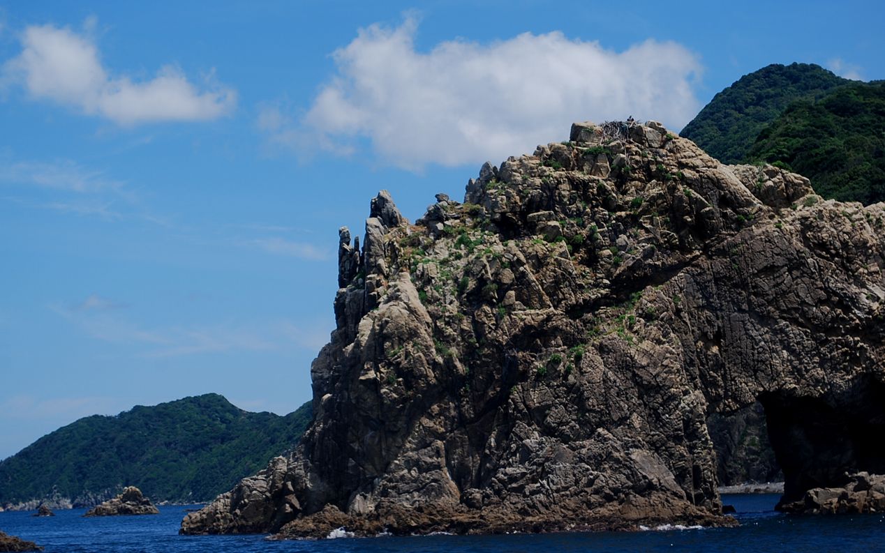 | 長門・青海島へ 萩市を出発して、約30分で先崎港の青海島遊覧船乗り場に到着します。途中、車窓から仙崎湾の景色が望まれ、山家生まれの私達には、言葉では言い表せない新鮮さが感じられます。 天候がよく、波も静かで、絶好の船の旅が期待できます。小さな船で青海島を一周する、90分のクルージングです。 船内から、あまりクリアーとは言えないガラス窓を透しての撮影となりましたので、ベストショットとは言えませんが、雰囲気は出ているのではないでしょうか。 1) 花津浦(はなづら) 2) 花津浦観音 3) コーモリ洞 4) 筍岩 5) アワビを獲っているのでしょうか? 6) 洞門へ進入します。 7) 平家台 8) 洞門内を抜けます。 9) 男性観音が現れます。 10) 大岩壁 11) 狭い洞門を抜けます。 12) 岩上での優雅な海釣りを楽しんでいる人も。 13) 大門 14) 仏岩 12時、無事に90分の青海島一周クルージングを終え帰港することが出来ました。今一度、仙崎湾を岸壁から眺めます。見事な絶景の連続でした。 さて、楽しみのお昼は、「海鮮村北長門」での「うに・アワビなど海の幸盛りだくさん料理」です。バスに乗り10分程で到着。沢山の観光バスが既に入ってはいましたが、もちろん、我々のお料理は準備が整っています。アワビの陶板焼きなど、期待どうりのお料理がならび、もちろんビールも頂戴しました。アワビの踊り、うに丼が旨かった!!!満腹!!満腹!!!、満足!!満足!!! |