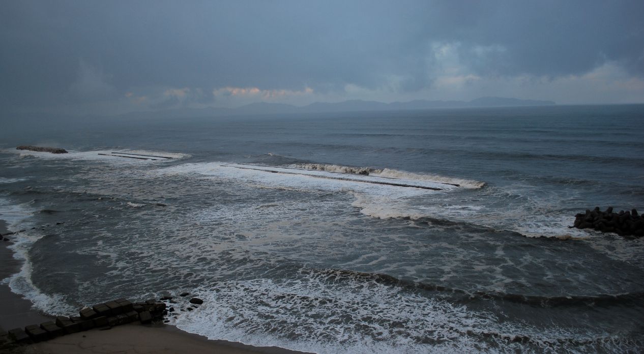 | 11月2日、 朝6時50分、砂浜に沿って建つ、ホテルの部屋からは波の高い海が目の前です。防波堤の隙間から入り込んでくる黒く淀んだ潮が不気味です。雨模様の空は暗く、夜明け前の姿です。正面遠くに、「美保関灯台」、「美保神社」がある「島根半島」の突先の「地蔵崎」がうっすらと見えています。7時半から朝食。 出発前、8時10分に、もう一度窓から島根半島方面を撮影します。波飛沫が防波堤を乗り越えてきていますが、空は雲の切れ間が見え出しています。9時にホテルを出発し、「境港」への道を取ります。天候によって島根半島の先っちょまでは諦めて、「妖怪の里」へ向うつもりにしています。 |