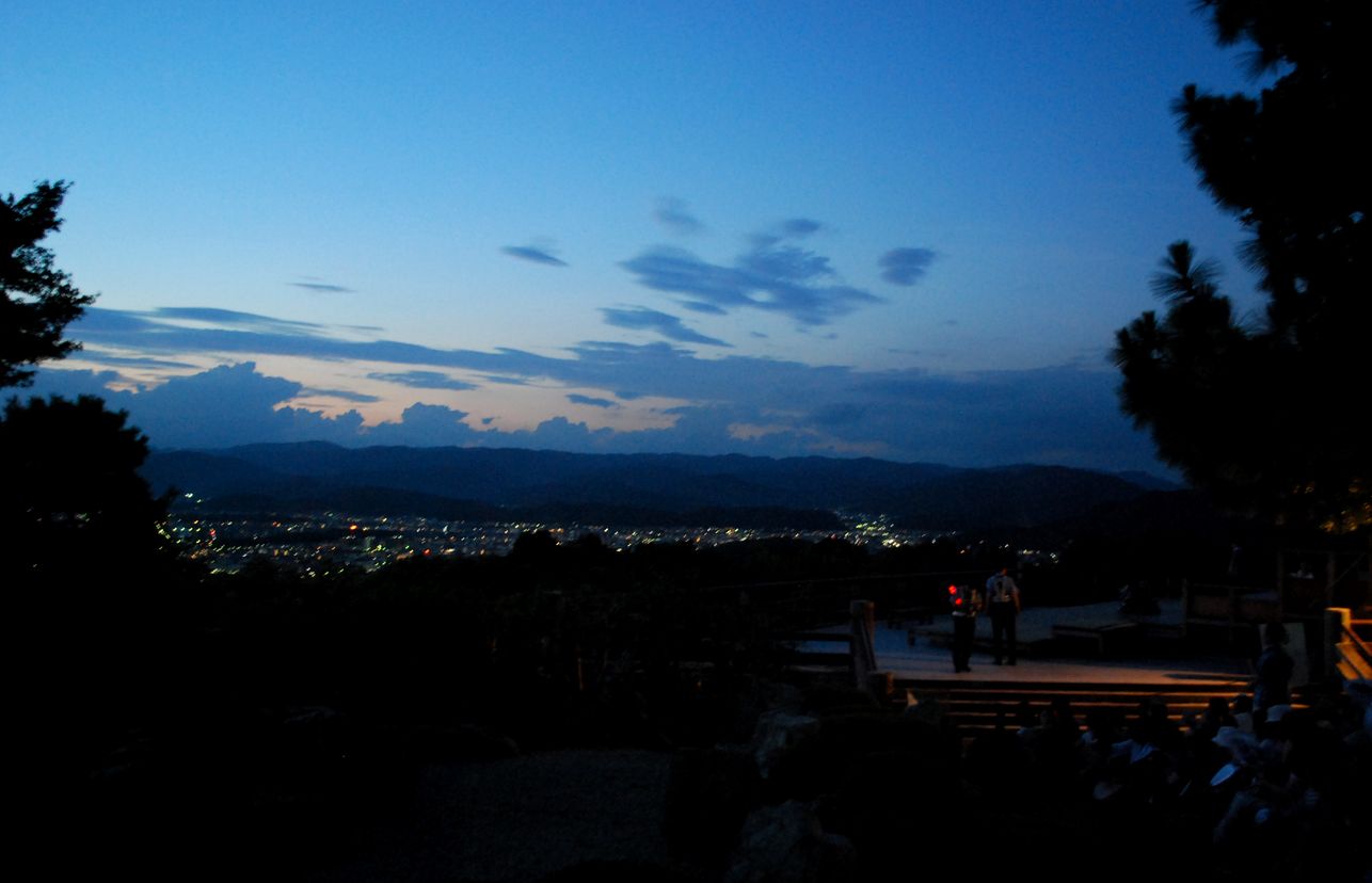 | 将軍塚での五山の送り火鑑賞 18時15分、「将軍塚」へ向います。車内で団扇を一枚ずつ頂戴します。表は「五山の送り火」のイラスト、 裏面は「青蓮院 大日堂 将軍塚」と墨書されています。 東山ドライヴウェイの頂上駐車場への道路は進入車をチェックするための検問所が設けられています。届け済み以外の車は通行不可となっているようです。18時45分、駐車場へ到着、大日堂へ向います。 「青蓮院門跡 大日堂 将軍塚」へは過去に2度ほど訪れています。その時は、「長楽寺」の脇の道をから、歩いて上がりました。「2009年2月11日 将軍塚へ登る」を参考にしてください。 この年の4月に東京、松本の仲間を案内する為の下見の為の登山で、本番は4月12日、13日でした。 大日堂境内の景色観賞用のテラスは全て「特別指定席」(係りの人は、料金は5000円ですが、指定券が残っているかどうかは分からないとのことでした。)となっており、それ以外の我々多数(もちろん他のバスツアーのお客さんも沢山含まれていますが。)は各々場所を定めることとなりました。20時の「如意ヶ嶽 大文字の点火」まで、1時間以上の待ち時間となります。 19時10分の情景 19時15分のお仲間達。 ここで、「五山の送り火」とは、ウィキペディアの概要を参照すると、 京の夏の夜空を焦がす京都の名物行事・伝統行事。葵祭・祇園祭・時代祭とともに京都四大行事とされる。 毎年8月16日に ・「大文字」(京都市左京区浄土寺・大文字山(如意ヶ嶽)。20時00分点火) ・「松ヶ崎妙法」(京都市左京区松ヶ崎・西山及び東山。20時10分点火) ・「舟形万灯篭」(京都市北区西賀茂・船山。20時15分点火) ・「左大文字」(京都市北区大北山・左大文字山。20時15分。 ・「鳥居形松明」京都市右京区嵯峨鳥居本・曼陀羅山。20時20分点火) 以上の五山で炎が上がり、お聖霊(しょらい)さんと呼ばれる死者の霊をあの世へ送り届ける。 大文字に点火されたと思われる20時、将軍塚からは「如意ヶ嶽 大文字」は同じ東山に位置する為、観ることは出来ません。「鈴虫寺」や「大河内山荘庭園」からは昼の間に遠望しています。 20時10分、「松ヶ崎妙法」が一瞬で点火されました。想像以上に大きな火文字2つの出現で感銘を受けたのは私だけではありません。周囲のどよめきがそれを証明しています。20時15分、「舟形万灯篭」が点火。大きな舟形です。「左大文字」はそれ以前から見えていましたが、火の勢いが増して明るくなっています。「鳥居形松明」は残念ながらこの場所では見ることは出来ませんでしたが、バス駐車場へ戻る際、この展望台から観る事が出来ました。山裾にこじんまりとした感じでの発見でした。 三脚を使用しない状態で、重い、300mm望遠レンズを使用したため、手振れが大きく、炎の写真は全滅でした。ジジ連仲間のIさんがの写真をお借りして、将軍塚からの送り火を紹介します。 1) 「松ヶ崎妙法」が同時に点火されました。 2) 妙 3) 法 4) 舟形 5) 左大文字 6) ウィキペディアからお借りした最もお馴染みの 如意ヶ嶽 大文字です。 幹事Sさんには感謝!!感謝!!!!!の大変楽しく、感銘深い、今日のジジ連旅でした。帰りの直通バス(21時15分)もギリギリ間に合うことが出来、思いのほか早く家に帰ることが出来ました。。 |