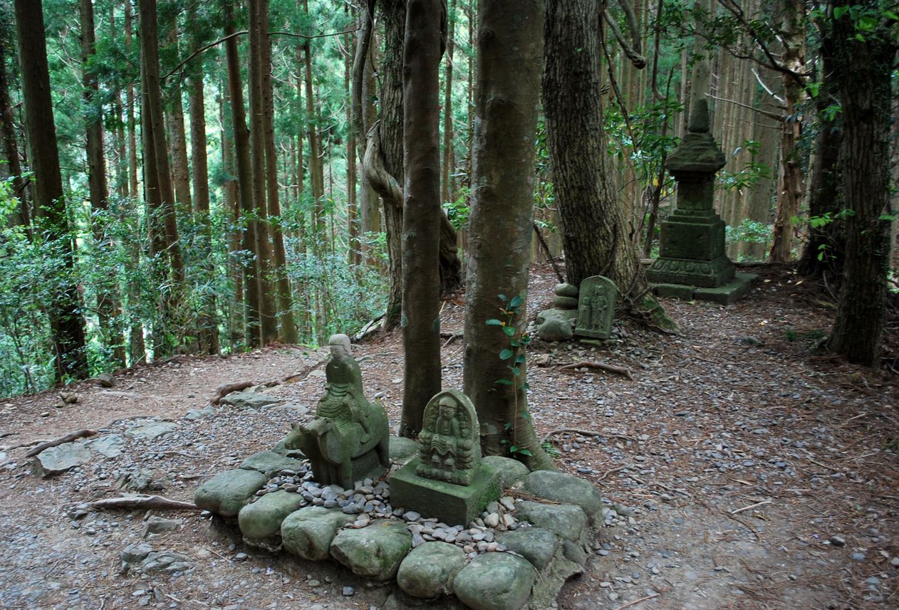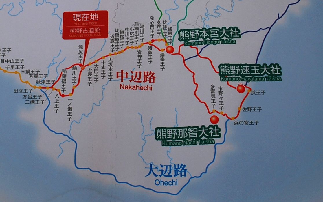 | 紀伊山地の霊場と参詣道 紀伊山地は太平洋に張り出した紀伊半島の大部分を指し、標高1000〜2000m級の山脈が東西あるいは南北に走り、年間3000ミリを超える豊かな雨水が深い森林を含む山岳地帯です。 紀伊山地は、神話の時代から神々が鎮まる特別な地域を考えられていました。中国から伝来した「仏教(真言密教)」も、紀伊山地を山岳修行の場としていました。また、仏教の影響力が強まるにしたがい「神仏習合」という日本固有の思想と「末法思想」が広まり紀州山地を「浄土」に見立てることや、修験道のように山岳修行により超自然的な力を獲得するといった修行の舞台となりました。その結果、紀州山地には「吉野・大峯」、「熊野三山」、「高野山」の三つの「山岳霊場」と、そこに至る「大峯奥駈道」、「熊野参詣道」、「高野山町石道」などの「参詣道」(巡礼道)が生まれ、都をはじめ全国から人々の訪れるところとなり、日本の宗教・文化の発展と交流に大きな影響を及ぼしました。 「紀伊山地の霊場と参詣道」は、和歌山、三重、奈良の三県にまたがる「紀伊山地の自然」がなければ成立しなかった「山岳霊場」と「参詣道」、及び周囲を取り巻く山、森、川、滝、温泉、田園などの「文化的景観」が主役であり、世界でも類を見ない資産として価値の高いものです。・・・(世界遺産 紀伊山地の霊場と参詣道 WORLD HERITAGE 和歌山県から) 世界遺産「熊野古道めぐり 今もなお、かっての面影をとどめる熊野古道。道ばたにひっそりとたたずむ王子(王子とは「神社」もしくは「祠・ほこら」の意とのことです。)跡。いつの時代にも旅人の心のよりどころとなってきました。熊野へ詣でたなら、不思議な力を授かると、中世になると、それは多くの人々の群れが熊野に続きました。その道のりは、苦しみが多いほどご利益も大きいといわれ、こぞって田辺から山中に分け入る険しい中辺路を好んだといわれます。 熊野九十九王子は、熊野に詣でる上皇や女院の休憩所となったところで、滝尻王子から熊野本宮大社に至る約38キロの間に19の王子が点在します。なかでも滝尻王子は熊野の霊域への入り口といわれ、人々は万感をこめてここから続く険しい坂を登ったことでしょう。景色の良い高原の里で少し休憩し、ここから山中に深く分け入ります。・・・(紀州路 田辺 熊野古道めぐり地図帳 和歌山県田辺市 から) |