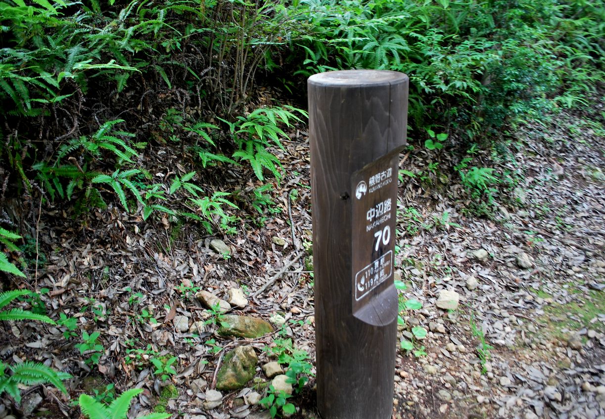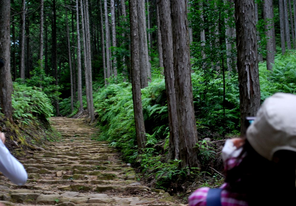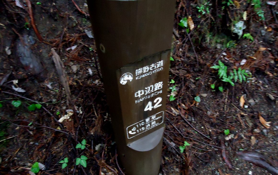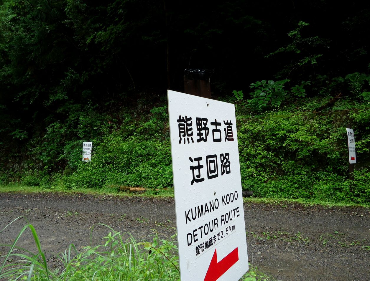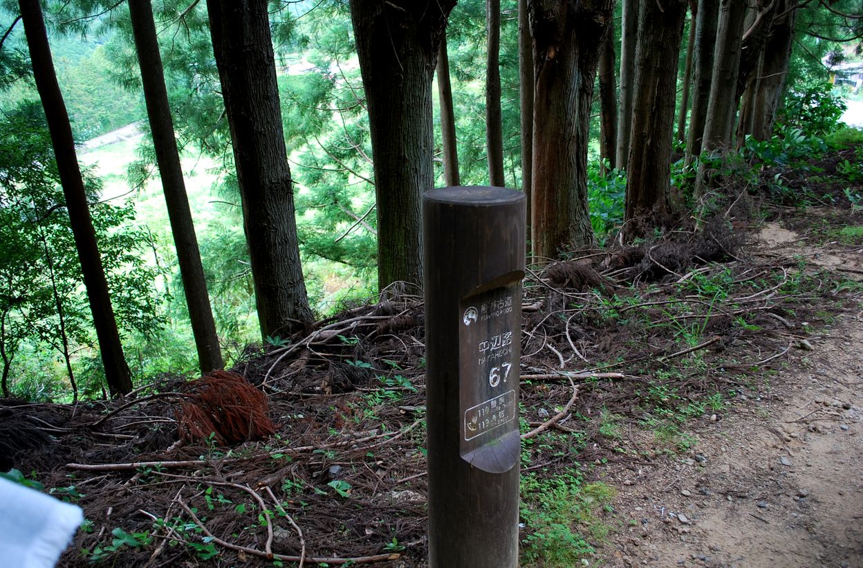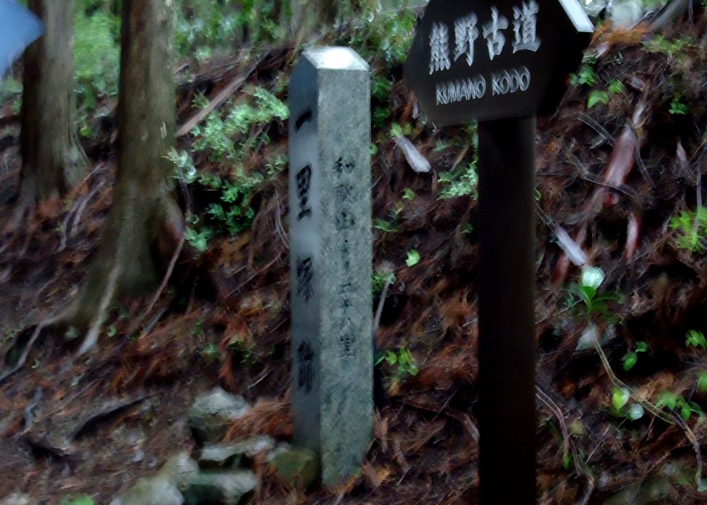 | [第4回 熊野古道・歩きの旅] 2013年6月12日 前夜まで、これほど天気予報が気になったことは、久しぶりのことでした。台風が北上し、11日の朝の時点では、紀伊半島を直撃する勢いとの報道がなされていたのです。でも、午後からの予報は、台風の進路が東にずれた為、直撃は免れ、大坂から和歌山県は昼から晴れ、東からの風のため、紀伊半島の東部分は強い雨が予想されると変化して来ていました。丁度この日、息子夫婦とマゴッチの梨央ちゃんは「ながしまスパーランド」へ前夜から行っており、そちらの方は逆に心配が出てきていました。 [第4回]は全5回のこの「歩き旅」の内で、最もタフと聞いているコースです。 小広王子(コビロオウジ)(スタート)・・・◎蛇形地蔵(ジャガタジゾウ)・・・◎湯川王子(ユカワオウジ)・・・◎猪鼻王子(イノハナオウジ)・・・◎発心門王子(ホッシンモンオウジ)(ゴール) 6月 難易度 ハイキング中級(トレッキング初級)(約11km 標高差 約350m) (一部、迂回路となるため「岩上王子」へは行けません。) それでも、雨具の用意は万全にして、朝 5時10分、家を出て松井山手駅へ向います。「大坂梅田芸術劇場」前の7時の集合時間15分前には到着していました。 7時10分に茶屋町駐車場を出発、難波で難波から乗車の方々を乗せ、35分には出発できました。この日、大坂は朝から快晴。空気が澄んでいるため、写真撮影にはもってこいです。高速道路から 「通天閣」を(7時42分)。 8時24分 「関空 連絡橋」を。 神戸の山々もくっきりと写っています。 「紀ノ川SA]の花壇の花々は最近の日照りの為か、見る影もありません。紀ノ川方面のワイド撮影をしています。 その快晴も、「湯浅御坊道路」、「阪和自動車道」を過ぎる頃怪しくなってきました。田辺市の上富田町に入ると上空は厚い雲に蔽われています。10時50分、「古道歩きの里 ちかつゆ」に着くと、霧雨が降り出していました。ここで、昼食のお弁当。 地図で今日の行程をチェックします(今日は標識40番から61番までの行程です。)。 バスで前回の最終地点「小広王子」へ向いました。 「小広王子」は、強くはありませんが、風交じりの雨降り。各々、雨具の着用となりました。 11時50分、古道の細い道に入ります。 グループの後続の方々は、未だバス道路を歩いています。 11時57分、標識 41番。今日は 61番までということを、語り部の松本さんから知らされます。ここから、10キロの道のりです。 雨の中を歩きます。 12時丁度、ここにも「お地蔵さん」が祀られています。 小広王子から600m歩いてきました。ここからは「熊瀬川王子」へ向います。 12時05分、「熊瀬川王子」に着きました。 「熊瀬川王子の解説板」。 12時12分、「一里塚跡」。 その解説板。 12時18分、標識 42番に。 12時24分、「草鞋峠」(592m)へ着くことが出来ました。小広王子からは一旦沢まで降り、それからの登りですから、標高差は不明ですが、時間は30分程度の登りであったと思われます。。 30秒後に、後続のお仲間が到着します。 草鞋峠からは、もちろん降り12時36分、標識 43番。 12時48分、一昨年の台風の為不通になっている「岩上王子」への道を避け、「迂回路」を紹介する地点に来ました。語り部さんによれば、復旧の目途は未だに立っていないとのこと。そして、迂回路は大変キツイ道のりであることを知らせてくれました。「蛇形地蔵」までは1時間30分の行程であることを記しています。 671mの「岩上峠」まではキツイ登りが予想されます。 しばらく、平坦な広い道を歩き、12時57分、迂回路に入ります。 沢を渡り、 花のトンネルを抜け、 13時丁度、いよいよ本番の登りに差し掛かります。先行グループが上方に小さく見えています。 13時33分、厳しい登りは続いています。 13時38分、標高を順調に稼いできていることを、周辺の山々が知らせてくれます。 登りの終点が近づいてきました。 13時44分、登りは続いていますが、杉木立の中に入ります。 14時16分、「蛇形地蔵」まで、1.2キロ地点まで。 14時18分、「岩上峠」(標高671m)に着き、各々が一息つく場面が現出しました。この間、標高で約200mの登り道でした。迂回路の表示からここまで、1時間30分かかっています。登りがきつくなると、お仲間の口数が少なくないり、前を歩く人の足元だけを見ながら登りに専念することになります。そんな1時間でした。キツカッタ!!! そして、14時33分、「蛇形地蔵」へ。迂回路表示からは1時間45分ほどかかったことになります。 「蛇形地蔵」をお祀りしてあります。 不鮮明ですが、お地蔵さんと背後の蛇形模様のある光背? 解説板です。 「蛇形地蔵」の朱印。 14時38分、平地に近い地形での川の流れが懐かしく感じられます。 雨はすっかり止み、木漏れ陽が苔と落ち葉、枯れ枝を照らしています。思わず、シャッターを押してしまいます。 14時42分、標識 51番です。ようやく今日の歩きの半分を消化しました。まだ、5キロ強の道のりです。 「湯川一族の墓地」を案内する掲示板がありま