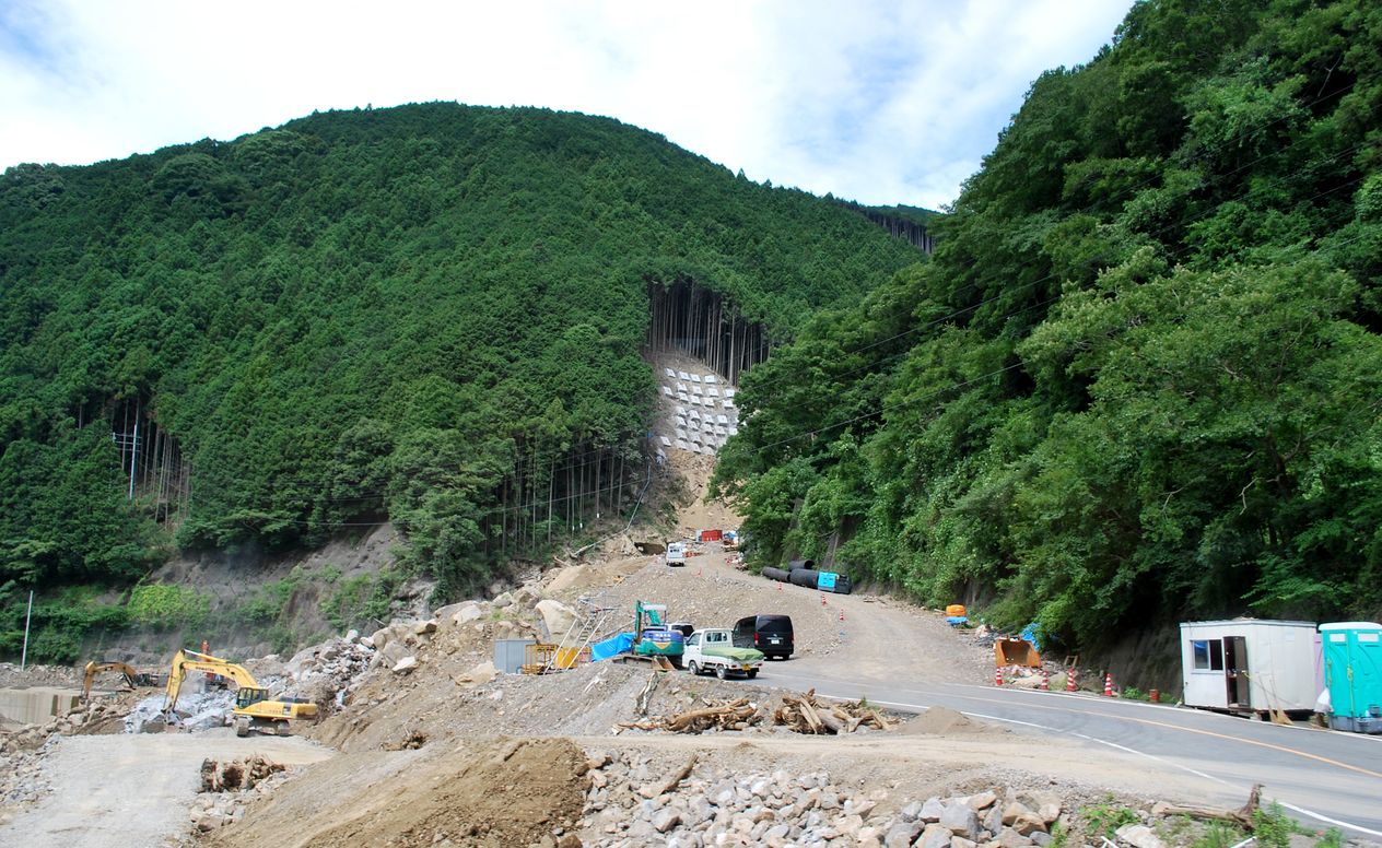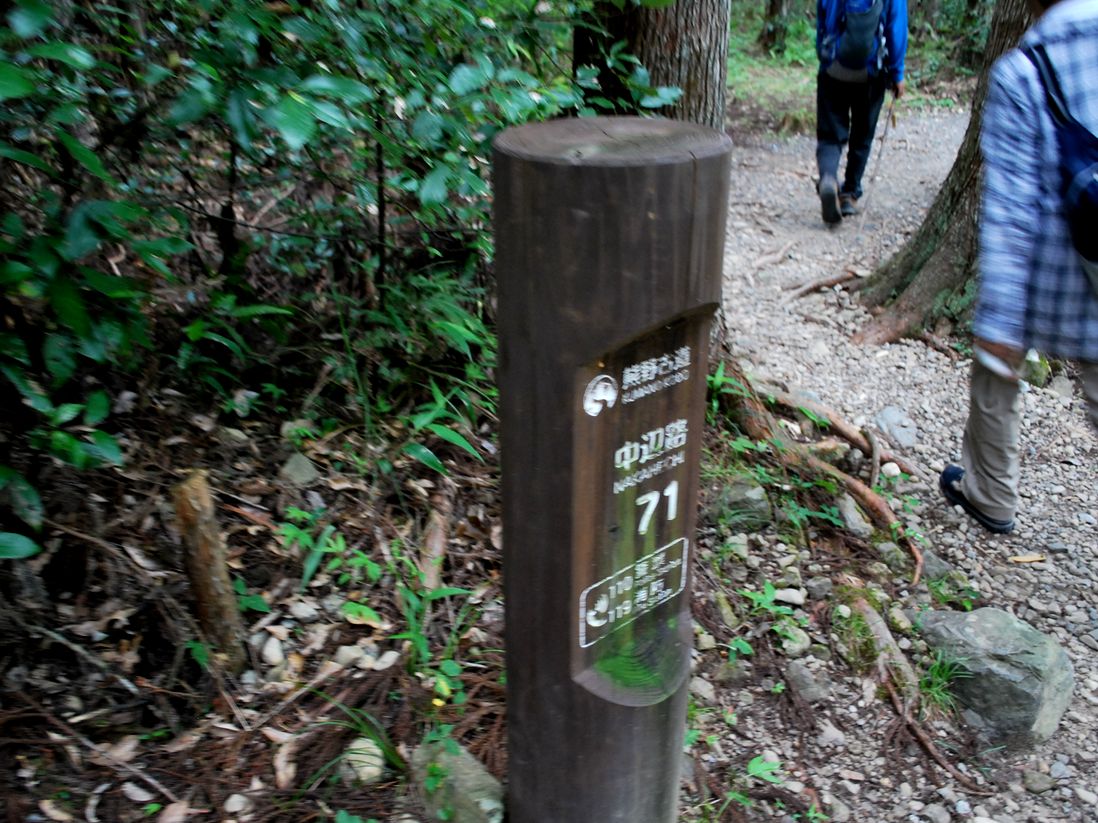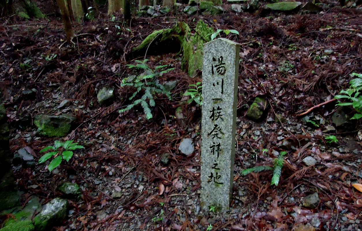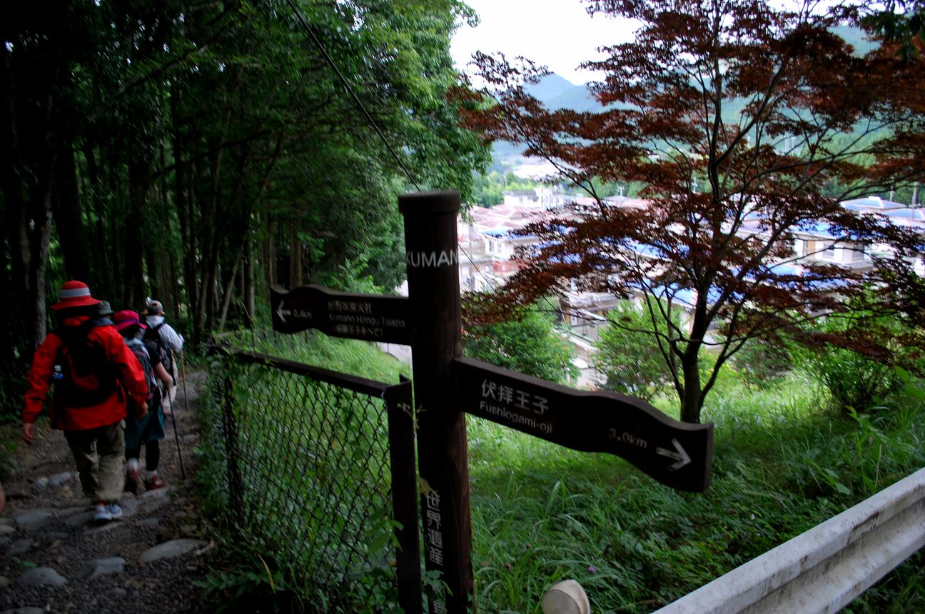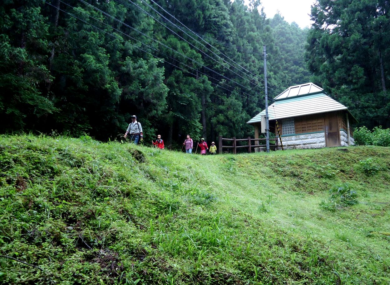 | [第4回 熊野古道・歩きの旅] 2013年6月12日 前夜まで、これほど天気予報が気になったことは、久しぶりのことでした。台風が北上し、11日の朝の時点では、紀伊半島を直撃する勢いとの報道がなされていたのです。でも、午後からの予報は、台風の進路が東にずれた為、直撃は免れ、大坂から和歌山県は昼から晴れ、東からの風のため、紀伊半島の東部分は強い雨が予想されると変化して来ていました。丁度この日、息子夫婦とマゴッチの梨央ちゃんは「ながしまスパーランド」へ前夜から行っており、そちらの方は逆に心配が出てきていました。 [第4回]は全5回のこの「歩き旅」の内で、最もタフと聞いているコースです。 小広王子(コビロオウジ)(スタート)・・・◎蛇形地蔵(ジャガタジゾウ)・・・◎湯川王子(ユカワオウジ)・・・◎猪鼻王子(イノハナオウジ)・・・◎発心門王子(ホッシンモンオウジ)(ゴール) 6月 難易度 ハイキング中級(トレッキング初級)(約11km 標高差 約350m) (一部、迂回路となるため「岩上王子」へは行けません。) それでも、雨具の用意は万全にして、朝 5時10分、家を出て松井山手駅へ向います。「大坂梅田芸術劇場」前の7時の集合時間15分前には到着していました。 7時10分に茶屋町駐車場を出発、難波で難波から乗車の方々を乗せ、35分には出発できました。この日、大坂は朝から快晴。空気が澄んでいるため、写真撮影にはもってこいです。高速道路から 「通天閣」を(7時42分)。 8時24分 「関空 連絡橋」を。 神戸の山々もくっきりと写っています。 「紀ノ川SA]の花壇の花々は最近の日照りの為か、見る影もありません。紀ノ川方面のワイド撮影をしています。 その快晴も、「湯浅御坊道路」、「阪和自動車道」を過ぎる頃怪しくなってきました。田辺市の上富田町に入ると上空は厚い雲に蔽われています。10時50分、「古道歩きの里 ちかつゆ」に着くと、霧雨が降り出していました。ここで、昼食のお弁当。 地図で今日の行程をチェックします(今日は標識40番から61番までの行程です。)。 バスで前回の最終地点「小広王子」へ向いました。 「小広王子」は、強くはありませんが、風交じりの雨降り。各々、雨具の着用となりました。 11時50分、古道の細い道に入ります。 グループの後続の方々は、未だバス道路を歩いています。 11時57分、標識 41番。今日は 61番までということを、語り部の松本さんから知らされます。ここから、10キロの道のりです。 雨の中を歩きます。 12時丁度、ここにも「お地蔵さん」が祀られています。 小広王子から600m歩いてきました。ここからは「熊瀬川王子」へ向います。 12時05分、「熊瀬川王子」に着きました。 「熊瀬川王子の解説板」。 12時12分、「一里塚跡」。 その解説板。 12時18分、標識 42番に。 12時24分、「草鞋峠」(592m)へ着くことが出来ました。小広王子からは一旦沢まで降り、それからの登りですから、標高差は不明ですが、時間は30分程度の登りであったと思われます。。 30秒後に、後続のお仲間が到着します。 草鞋峠からは、もちろん降り12時36分、標識 43番。 12時48分、一昨年の台風の為不通になっている「岩上王子」への道を避け、「迂回路」を紹介する地点に来ました。語り部さんによれば、復旧の目途は未だに立っていないとのこと。そして、迂回路は大変キツイ道のりであることを知らせてくれました。「蛇形地蔵」までは1時間30分の行程であることを記しています。 671mの「岩上峠」まではキツイ登りが予想されます。 しばらく、平坦な広い道を歩き、12時57分、迂回路に入ります。 沢を渡り、 花のトンネルを抜け、 13時丁度、いよいよ本番の登りに差し掛かります。先行グループが上方に小さく見えています。 13時33分、厳しい登りは続いています。 13時38分、標高を順調に稼いできていることを、周辺の山々が知らせてくれます。 登りの終点が近づいてきました。 13時44分、登りは続いていますが、杉木立の中に入ります。 14時16分、「蛇形地蔵」まで、1.2キロ地点まで。 14時18分、「岩上峠」(標高671m)に着き、各々が一息つく場面が現出しました。この間、標高で約200mの登り道でした。迂回路の表示からここまで、1時間30分かかっています。登りがきつくなると、お仲間の口数が少なくないり、前を歩く人の足元だけを見ながら登りに専念することになります。そんな1時間でした。キツカッタ!!! そして、14時33分、「蛇形地蔵」へ。迂回路表示からは1時間45分ほどかかったことになります。 「蛇形地蔵」をお祀りしてあります。 不鮮明ですが、お地蔵さんと背後の蛇形模様のある光背? 解説板です。 「蛇形地蔵」の朱印。 14時38分、平地に近い地形での川の流れが懐かしく感じられます。 雨はすっかり止み、木漏れ陽が苔と落ち葉、枯れ枝を照らしています。思わず、シャッターを押してしまいます。 14時42分、標識 51番です。ようやく今日の歩きの半分を消化しました。まだ、5キロ強の道のりです。 「湯川一族の墓地」を案内する掲示板がありま