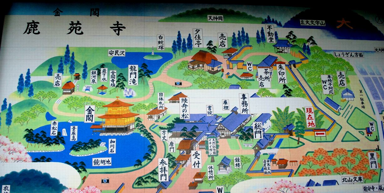 | 臨済宗相国寺派 金閣・鹿苑寺 5月20日、午後1時、京都グランヴィアホテルロビーに6人が集合、荷物を預け、タクシーで金閣寺へ向かいます。2時頃には金閣寺へ到着、バス駐車場には多くのバスが止まり、多数の修学旅行生徒が列を作り歩き進んでいます。その多さにジジイ組6人は圧倒されます。 受付で参拝料を支払うと、「金閣寺舎利殿 御守護」のお札をいただきます。入り口ではこのお札を提示し、言葉別(日本語・英語・中国語・韓国語のようです)の入場券をもらいます。我々はもとろん日本語のものです。 「鏡湖池」の向こうには金箔で覆われた金閣(舎利殿)が望まれます。見事なものです。桜の時期を過ぎ、池には紫の「カキツバタ」が印象的です。さらに池の中央に「蓮の花」が開き始めています。 「金閣(舎利殿)」は、金箔を張り詰めてから時間がたち、落ち着いた輝きが増していました。日本にとっては大切な宝物でしょう!!! ここで、杜若(カキツバタ)、花菖蒲、あやめ(菖蒲)について。 杜若ー水辺に咲いている。中輪・せいは50〜70cm・花弁の元に白の目型模様。5月中旬から6月中旬。 花菖蒲ー水辺に咲いている。大輪・せいは80〜100cm・花弁の元に黄色の目型模様。5月下旬から6月中旬。 あやめ(菖蒲)−乾いた土地に咲いている。小輪・30〜60cm。 1) 金閣前の鏡湖池には紫色の杜若(カキツバタ)が。(A) 金閣(舎利殿) (B) (C) (D) 2) 鏡湖池にハスが咲き始めています。(A) (B) 4月9日、嫁さんとの下見の折の金閣寺はさくらの花が満開でした。その折の写真を以下に。 1) (A) 金閣(舎利殿) (B) (C) 「屋上の鳳凰} (D) (E) (H) 2) (A) 「銀河泉」 (B) 「巖下水」 (C) 「金閣寺垣」 (D) 「龍門の瀧」・「鯉魚石」 (E) 「白蛇の塚」 (F) 高台から金閣の地勢を確認します。 (G) お抹茶が楽しめます。20日は仲間と美味しい時間を楽しめました。 (H) 桜の花びらが散っています。 (I) 苔の散る花弁の風情は日本のものです。 栞の金閣寺部分は 金閣寺 鹿苑寺(ろくおんじ) 応永4年(1397)広大な山荘(西園寺公経の山荘)を手に入れた義満は「文化的自己主張」としての金閣(舎利殿)を中心に、新たに華麗な殿楼の造営をはじめるのである。義満はここで政務をとり、公家貴族をあつめて和歌や管弦、猿楽を催し、のちに北山文化といわれる華やかな一時期を開く。 そして、ようやく応永15年に後小松天皇の行幸を迎えて盛大なかつ正式な御ひろめをおこなったわけで、義満の自己主張は天子に届いたのである。しかし、義満は咳病を患って2ヶ月後に急逝してしまう。(毒殺説も)法号は「鹿苑院天山道義」、鹿苑院とは、釈尊が仏の悟りをえたのちはじめて説教した場所の「鹿苑苑」からの名である。・・・(以上「京都の寺社 505を歩く」 |