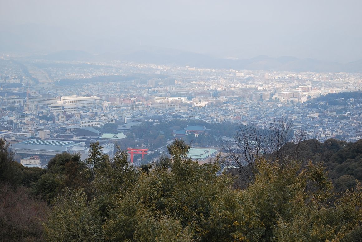 | 2009年2月11日 将軍塚へ登る 天気ははっきりしない様子ですが、雨が落ちる心配がなさそうなので、東山から京都市内を展望する場所として著明な「将軍塚」へ登ることとし、京阪祇園四條から歩きます。円山公園を抜け、竜馬・慎太郎像を過ぎ、更に登ると、「将軍塚道」の道標を発見、その道を登ります。結構キツイ坂道を道標から役20分、青蓮院門跡 別院 大日堂に着きます。「将軍塚」はこの大日堂敷地内にあります。 敷地内は大変整備されたお庭で、花のシーズンに訪れる人を魅了するところであることは間違いない雰囲気を持っています。大隈重信先生のお手植えの松、一念松などの横を通りまずは北展望台から市内の北方を眺めます。曇り空の中、京都御所の木々が黒々と、賀茂川と高野川の合流地点が、そして下鴨神社が見分けられます。枯山水庭園(造園家 中根金作氏の作庭したものである。この庭の作庭手法は枯山水の生まれた室町時代、即ち日本庭園が技術的にも芸術的にも最も優れた時代の手法を用いて作庭されたもので、一見して作庭者の意図する着想が庭の隅々まであふれている野新作である。以上パンフレットから)、咲き始めるのが待ちどうしい枝垂桜庭園を抜けると”将軍塚”があります。将軍塚の由来についてパンフレットでは、桓武天皇は都を奈良から京都の南方の長岡に移されたが、いろいろと事故が続いた。この時、和気清麻呂は狩にことよせ天皇をこの山上のお誘いし京都盆地を見下ろしながら、都の場所にふさわしい旨進言した。天皇はその勧めに従って延暦13年(794年)に整然とした区画の大規模な都の建設に着手されたのである。天皇は、京都盆地は三方が山に囲まれ、帯のように河も流れて自然に城のような地形をしているから山背の国を山城の国と定め、都は平安京と呼べと申された。また、長くこの都を護るようにとの祈りをこめて、高さ2.5メートル程の武将像を土で作り、これに、鎧甲を着せ鉄の弓矢を持たせ、太刀を帯びさせここに埋めるように命じられた。この塚を将軍塚という。としています。将軍塚の横に鉄骨で組んだ巨大な西展望台がありました。上からの眺めは清麻呂の意図そのままのもので京都盆地を一望しています。感動!!!今度は天気が良く見晴らしの良い時、また、夜景を眺めにとの気力が沸いてきます。 いまひとつの景観ですが、 1) 御所の木々か黒々と。 2) 平安神宮の赤の鳥居が。 |