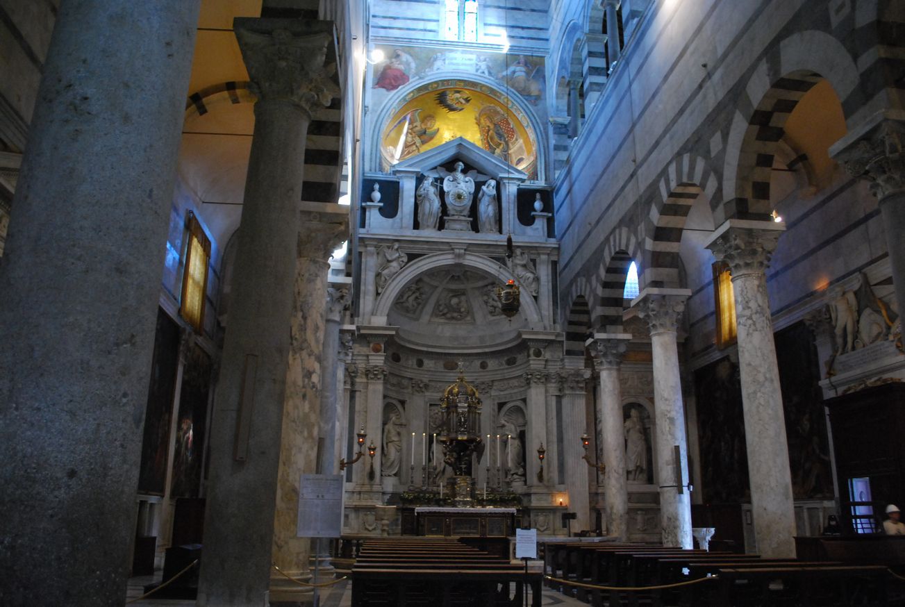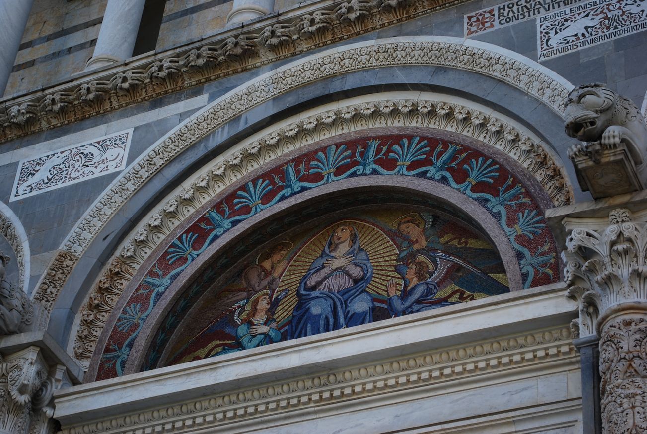 | 11月6日 ピサ フレンツェ市内・ウフイッツィ美術館へ ガリレオの逸話と写真では馴染みの深い「ピサの斜塔」を自分の目で確かめられるという記念すべき日となりました。まだ薄暗く感じられる7時45分ホテルを出発し、ピサまでの約80キロ、高速道路を疾走し、9時15分に到着しました。駐車場からはシャトルバスが。寺院の内外を分ける城壁にそって三角屋根の土産物屋さんが並んでいます。そして、半円形の小さなくぐり戸と感じられる入り口からその姿が浮かび上がって来ます。お!!あれが斜塔だ!!! ピサの斜塔はピサ大聖堂の鐘楼として1173年建設が始められ、14世紀前半に完成されたとされています。途中、地盤沈下による傾斜が始まったため、工事中止。3回までの傾斜した部分の上に、角度を修正したような形で上部を建設したということをガイドさんが説明してくれました。見た目には言われればそのようかな?とも思いますが、一番斜頚を感じられる角度から眺めると「なぜ、倒れないのかな?」という疑問のほうが大きいのではないでしょうか? 斜塔ばかりが有名ですが、この大聖堂は素晴らしく感じられます。広い敷地の中に点在する「大聖堂」・「洗礼堂」・「納骨堂」は「斜塔」とあいまって素晴らしい景観を作り出しています。 1) 大聖堂(ドゥオモ)は1063年建設が開始され、12世紀始めに完成されたとされています。ピサ地域の勢いが大変良い時代に建設されたものと思われます。 全景です。 正面を見上げています。 左部分をアップで。 扉上のモザイク模様を。 マリア像のモザイクをアップで。 大聖堂内は華麗な中にも厳かな雰囲気が充満しています。 正面祭壇に近ずきます。 上部肖像画 キリストの磔刑像 見事なステンドグラスの聖母像。 天井に目を向けると。 円形部の天井画。 正面祭壇のほかにもミサが行われるであろう礼拝所があります。 2) 洗礼堂 1152年建設が開始され、14世紀中ごろに完成。高さ85m。1階がロマネスク様式、2階より上はゴシック様式と時代背景による融合が見られ、ピザロマネスク様式と呼ばれているようです。クーポラが大変印象的な建物です。 洗礼堂全景 正面入り口方向から 中段部分の彫像 クーポラ上部 頂上の聖使徒 正面入り口上部聖母像 3) 納骨堂 回廊上部の塔に特徴がみられる様に、イタリアゴシック様式の代表的建物といわれています。 4) 鐘楼 ピサの斜塔です。高さは約55m。その傾斜は? 近くから見上げてみます。 斜塔へ登ることはチケット時間の関係で出来ませんでしたが、域内の佇まいと大聖堂内の素晴らしい雰囲気を味わうことが出来、十分満足させられました。 |