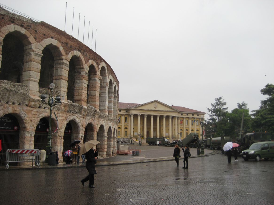 | 11月8日 ヴェローナ ミラノへ 7時の食事、7時半出発までの時間、ホテルの近くを散策します。ホテル裏手は大運河(Canal Grande)で、歩いてすぐにスカルツィ橋があり、橋の上からホテルプリンチペの運河に面した玄関(ヴェネッチァでは運河に面したほうが主玄関との話があったと思いますが。)がサン・ジェレミア教会を後に望めます。7時半ホテルを出発。サンタ・ルチア駅裏を通り、ヴェネチィアでの運河の最後の風景を楽しみながら、バス乗り場の”ローマ広場”へ向かいます。 ヴェローナへ向かう途中に雨が降り出しました。Verona (歴史都市ヴェローナは紀元前1世紀に誕生し、13〜14世紀にはスカラ家統治下、15〜18世紀にはヴェネツィア共和国の一部として栄えた。古代ローマ時代の円形闘技場アレーナや、中世に城ステル・ヴェッキオ、ルネッサンス期の建築物等を多く今に残している。ロミオとジュリエットの舞台ともなっている美しい街はまた、芸術をとりいれながら2000年に渡りたゆまず発展し続けた要塞都市の好例である。以上 イタリアの世界遺産より) ヴェローナ市街へ入る前で渋滞に巻き込まれます。添乗員さんが「日曜日だし、こんなことは無いはず?」との独り言。この原因は展示会会場の 「International Horse Festival」の最終日にあたっていたのです。この渋滞がヴェローナを出る時に我々の車に直接被害がでるとは、「神のみぞ知る」ことがらでした。凱旋門らしき建築物を回り込むように、旧市街地へ入ります。この日は、「イタリア軍の記念日」にあったていたらしく広場には各種兵器の姿がバスの窓から眺められます。このための交通渋滞も含まれていました。 駐車場から「ジュリエットの家」に向かいます。途中、「古代の遺跡」を道路に穴を開けて展示している所、貝の化石が刷り込まれた大理石の道路石などを見ながら目的地「ジュリエットの家」へ。やはりわたし達と同様の観光客が群れを成しています。雨が激しくなり、「ジュリエット像」での撮影もそこそこに。古色蒼然たる市街地を歩き、「エルベ広場」などを経由して、「アレーナ」(円形闘技場)前広場へ。ここは各種兵器が展示され、雨の中ですが、市民の見物客も多数楽しんでいます。 雨の中をバスまで急ぎます。町をめぐる河を渡り、郊外へ。ヴェローナの市街地へ向かう時に渋滞に巻き込まれた博覧会場の前で、バスは会場から出庫しようとする車に当てられます。災難です。双方に怪我人は無く、非は100%乗用車でしたので、運転者同士の話し合いで解決し、ミラノへ向かうことが出来ました。大きな事故であれば多くの時間がとられた事でしょうが、不幸中の幸いということで終わりました。 |