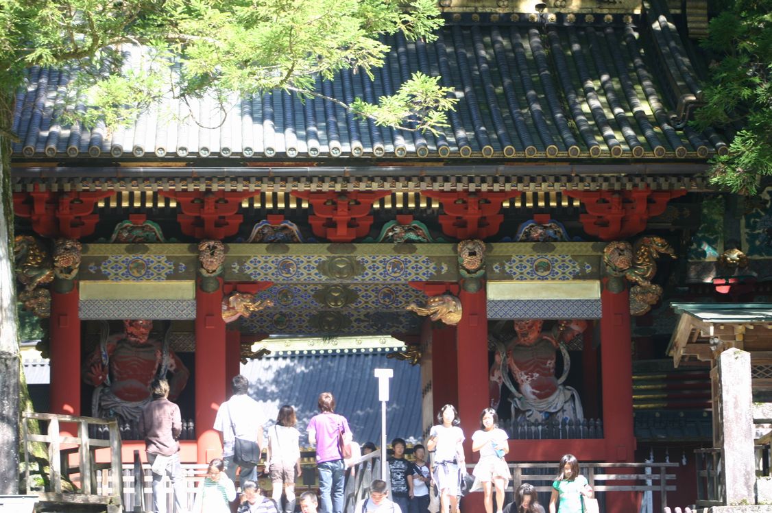 | 東照宮 輪王寺の左手の門をくぐるとそこは東照宮の参道です。日光東照宮ホームページによる由緒・社殿の解説は以下のように記されています。 日光東照宮は、元和(げんな)3年(1617年)徳川初代将軍家康公を御祭神におまつりした神社です。・・・家康公は、元和2年4月17日駿府城で75歳の生涯を終えられ、直ちに久能山に神葬されました。そして御遺言により、1年後の元和3年4月15日、久能山より現在の地に移されおまつりされました。正遷宮は、同年4月17日二代将軍秀忠公をはじめ公武参列のもと厳粛に行われ、ここに東照社として鎮座しました。その後正保2年(1645年)宮号を賜り、東照宮と呼ばれるようになりました。 現在の社殿群は、そのほとんどがご鎮座から20年後の寛永13年(1636年)に建てかえられたものです。陽明門(国宝)など55棟、その費用は、56万8千両、銀百貫匁、米千石を要し、ご造営の総責任者には秋元但馬守泰朝(やすとも)、工事や大工の総責任者には大棟梁甲良豊後宗弘がわずか1年5ヶ月の工期で完成しました。・・・建物には、漆や極彩色がほどこされ、柱などには数多くの彫刻が飾られていますが、これらは単なるデザインではなく、信仰形態や学問・思想があらわされています。これらの社殿群は平成11年12月「世界文化遺産」に登録されました。 以下東照宮を目指し、巡ります。その建物の無数で細微な彫刻・華美な色彩は確かにこれらを見てから始めて”けっこう”という言葉を言えるようになりました。感動しました!!! 1) 輪王寺から東照宮への参道へ。正面に石鳥居(重文)その奥に表門(重文)が。 2) 石鳥居をくぐると左手に五重塔(重文)があります。若狭の国小浜藩酒井氏の建造、再建 3) 表門(重文)。左右の仁王像が安置されていることから仁王門とも。 4) 表門の上部。東照宮の彫刻が始まりました。 5) 表門を抜けると正面に極彩色鮮やかな三神庫(さんじんこ)(重文)に眼を奪われます。 6) 不思議な象の彫刻「想像の象」(加納探幽下絵)に思わず笑いが。 7) 華やかな三神庫の後ろに三猿の彫刻で有名な神厩舎(重文)が地味にひかえています。猿の一生を彫り込んだ中に三猿の彫刻が入っています。人間の一生を風刺し、猿が馬を守るという言い伝えを彫刻しているようです。 8) 正面に三猿を含め5景 そして 横に2景の彫刻があります。 9) 石の階段の上には陽明門(国宝)が。 10) 陽明門 その細部1 細部2 細部3 細部になればなるほど見事で不可思議な世界が。 御本社(国宝)に入ります。床工事中の拝殿横から本殿正面へ。宮の方からお話を聞き、参拝します。眠り猫は入り口写真のみの見学となりました。