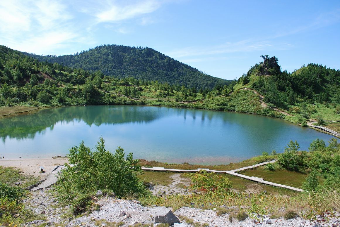 | 最後の噴火は1989年の小噴火ということで、現在は休止状態と言われていますが、もちろん、何時噴火するかはお山しだい、「我々が登山中は休んでいてね」とお願いするばかりです。長径350メートル短径270メートル、蔵王のお釜より若干小さめかなと感じます。湯釜3景 1) 2) 3)あっぷで! 火山の有様を如実に表せている湯釜の反対側には、弓池があります。思わず心が和みます。 10時半、駐車場を出発し信州に向かいます。スキーのメッカ、横手山(2152M)から志賀高原を経て、中野市へ。ビアンテ信州中野で美味しいしゃぶしゃぶの昼食と買い物。善光寺へ向かいます。 |